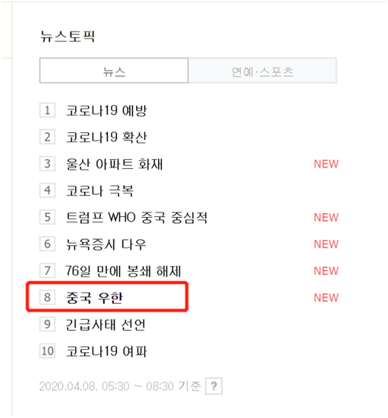 韩国最大搜索网站NAVER:“中国武汉”热搜第8