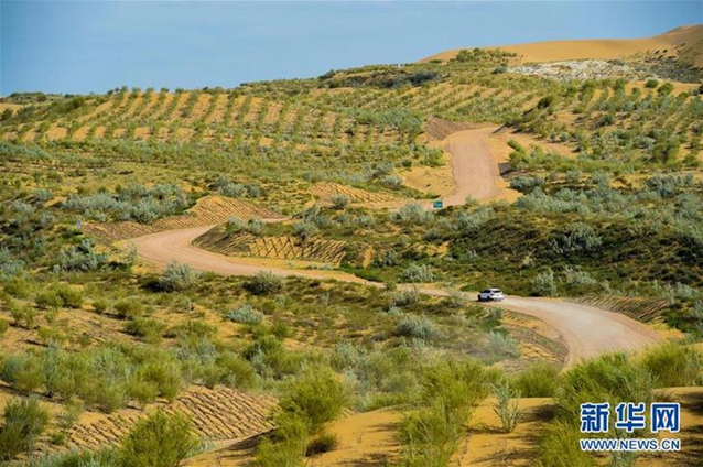 车辆在银肯塔拉沙漠绿洲自然生态旅游区中穿行(6月7日摄)。新华社记者彭源 摄