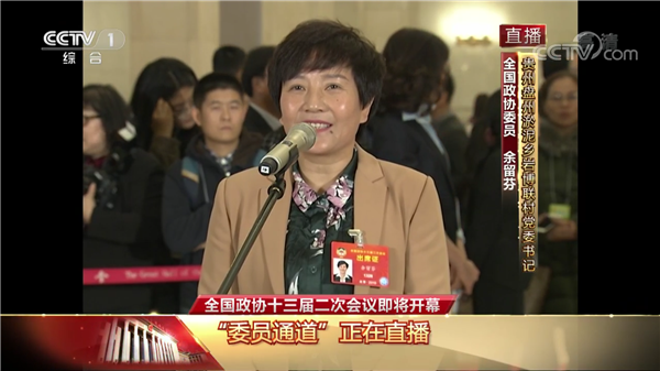 图为余留芬在委员通道接受采访。图片为央视网直播截图。
