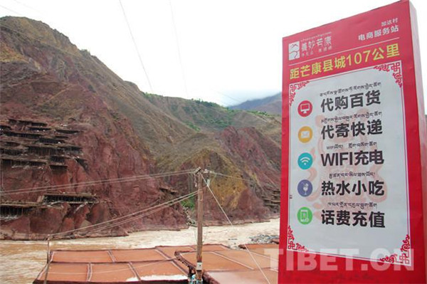 图为千年古盐田边的芒康县农村电商服务站广告牌。摄影:李元梅