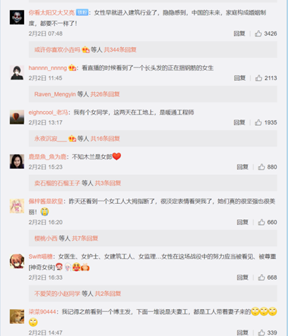 据中建三局总承包公司统计,自火神山医院项目开工以来,共有18名“铁娘子”出征。现场还有更多叫不出名字的建筑女工。网友评论说,抗击疫情的功勋章里,离不开她们的贡献。“疫情就是命令,建功立业,巾帼从来不让须眉”“不知木兰是女郎”。