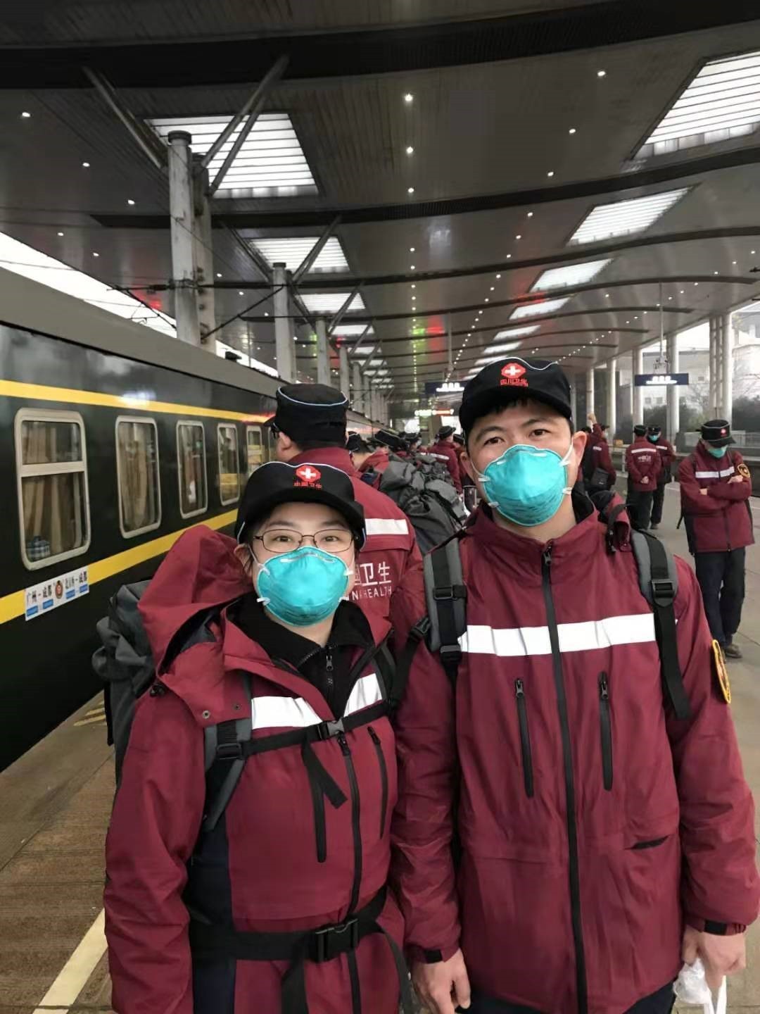 孙颖(左)与苏明华(右,同为国家(四川)紧急医学救援队的队员)到达武昌火车站的照片。(由华中科技大学同济医学院提供)