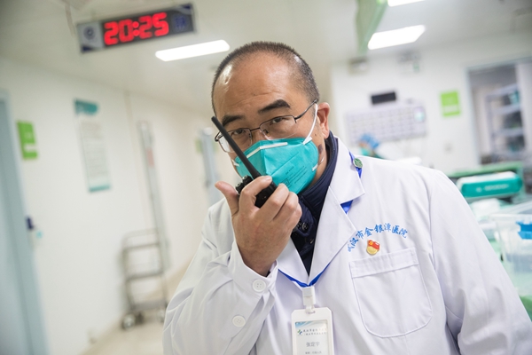 武汉市金银潭医院党委副书记、院长张定宇用对讲机了解病房情况
