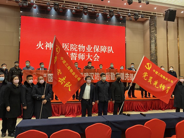 2月2日,武汉市物业行业党委负责人向火神山医院物业服务“党员突击队”“党员先锋岗”授旗(中共武汉市委组织部供图)