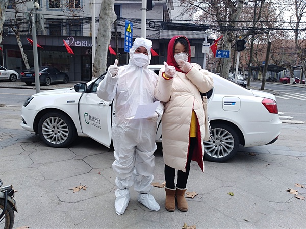 武汉市青山区红钢城街和悦社区干部、“好样的工作队”司机护送孕妇去医院检查(中共武汉市委组织部供图)