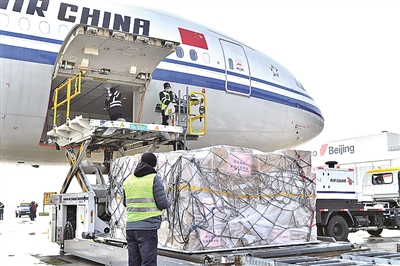 2月7日,北京首都国际机场,来自6家医院医护人员携带的防疫物资正在装机,准备飞往武汉。尹璐摄/光明图片
