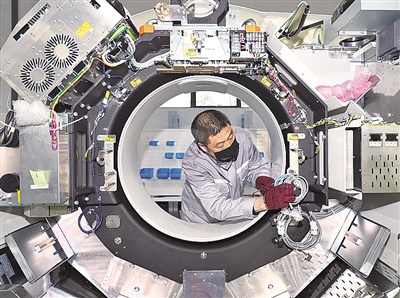 2月11日,浙江省宁波梅山保税港区的康达洲际医疗器械有限公司员工正在组装CT机。新冠肺炎疫情发生后,该公司组织员工加急生产,目前发往全国各地的CT和移动DR等医疗设备有100多台,并捐赠价值2700万元的CT机9台。陈张坤摄/光明图片