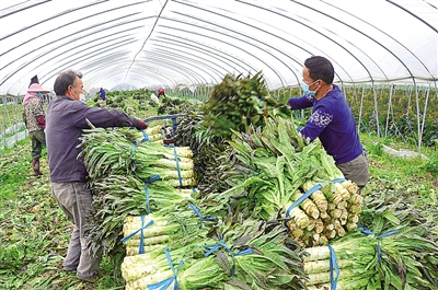 2月10日,浙江温岭市滨海镇新农村村民装运刚刚从蔬菜基地采收的莴笋、大白菜。连日来,新冠肺炎疫情牵动着社会各界人士的心,滨海镇共产党员施永华向菜农收购新鲜蔬菜20多吨捐赠武汉。郑玲富摄/光明图片