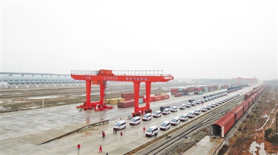 2月12日,江铃集团生产的72辆救护车(其中67辆为负压监护型救护车),在江西省南昌市向塘铁路物流基地集结,等待装上中铁特货班列驰援武汉。丁波摄/光明图片