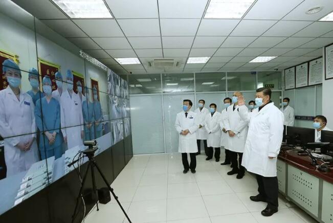 2月10日,习近平来到首都医科大学附属北京地坛医院门诊楼一层运行监控中心,通过监控画面察看患者住院诊疗情况,并视频连线正在病房值班的医务人员。
