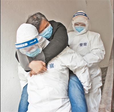 2月18日下午,湖北十堰张湾区公安分局汉江路派出所民警将辖区患者刘某背下楼,驱车送往医院就诊。柯文彬摄(人民视觉)