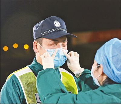 浙江省舟山市公安局定海分局的“90后”民警杨晨华积极投身抗疫一线,与作为医护人员的妻子方梦霞每周只有一次见面的机会。2月10日晚,在舟山跨海大桥金塘高速通道防疫工作站,方梦霞帮杨晨华整理口罩。邹训永摄(新华社发)