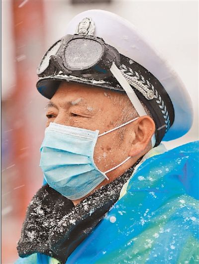 2月15日,湖北襄阳檀溪警务平台即将退休的民警陈顺意雪天坚守隆中高速路口疫情防控值勤点。张 伟摄(人民视觉)