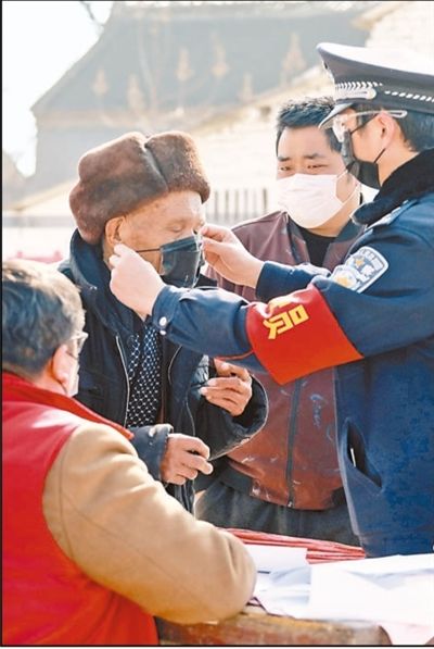 2月11日,河南省新郑市辛店派出所所长刘博为没有佩戴口罩的老人戴上自己备用的口罩。毕京津 高素萍摄影报道