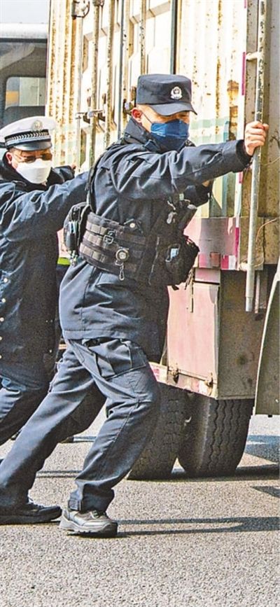 2月11日,福建省平潭综合实验区公安局交警支队支队长张鼎(左)和民警余国民一同帮助故障车辆顺利通过值勤点。邵玉姿 余杉芳摄影报道