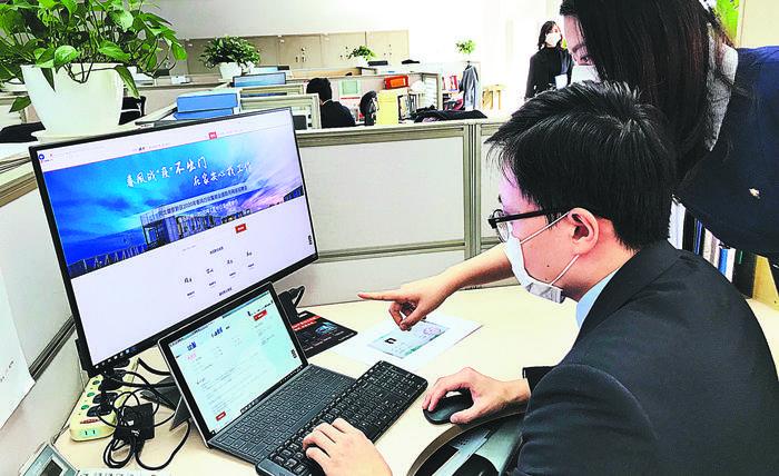 国投在雄安新区承办“春风行动”专场招聘会,国投人力资源服务有限公司首批将联合多家中央企业组织开展网络招聘活动,图为工作人员通过电脑查看网络应聘资料。 孟书豪摄(中经视觉)