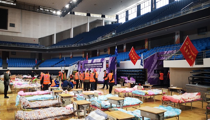 中国一冶突击队火速建设武汉洪山体育馆“方舱医院”。
