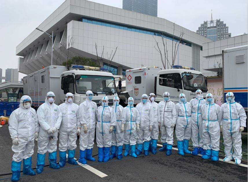 来自中国航天科工的“移动医院”装备保障队员和上海复旦大学附属华山医院医护人员在武昌方舱医院前合影。
