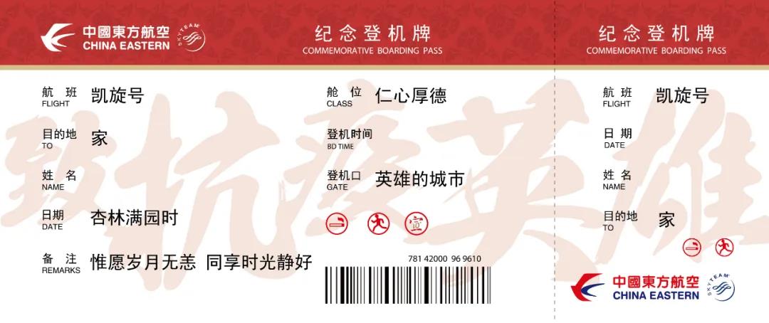 东方航空官方微博特地为迎接抗疫英雄回家打出了一张特别的“纪念登机牌”,从英雄的城市起飞,报以“仁心厚德”,带着“惟愿岁月无恙,同享时光美好”的美好祝福回“家”,这是对抗击疫魔、守护山河的白衣天使们最诚挚的感谢与最崇高的致敬。