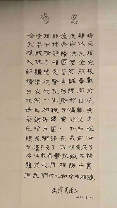 “在方舱医院,我第一次见到上千人一起居住的病区,这和我以前看到过的病区截然不同。”巴哈古丽说:“刚到武汉时,物资准备都需要我们自己完成,我作为领队的协助者、联络员,每天要协调很多事情,既是物资搬运工,也是病区清洁工、消毒人员。不过我们得到了武汉当地爱心人士和酒店工作人员的支持,帮助我们很快克服了这些困难。”