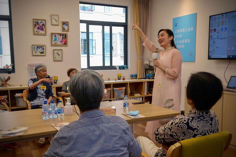 7月16日,上海市长宁区,虹桥街道社区综合为老服务中心,昆曲闺门旦演员赵津羽正在向认知症老人教授简单的昆曲动作。2018年以来,长宁区开展了覆盖2.4万名老年人的社区筛查,通过大数据分析得出,老年认知障碍发病率约为7.2%。如今,上海这座城市的老龄化程度已超过35%,认知症老人的数量也在不断攀升。长宁区虹桥街道社区综合为老服务中心发挥社区养老“枢纽”定位,开展下沉式家门口为老服务,向社区辐射出一张“幸福养老”服务网络。中青报·中青网见习记者 张玉佳/摄