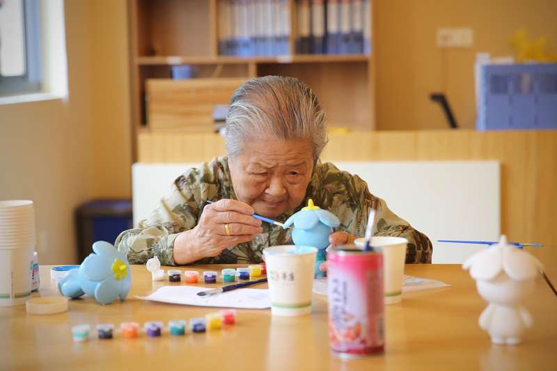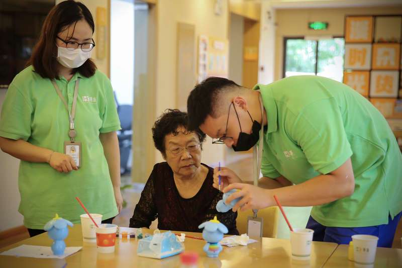 7月16日,上海市长宁区,虹桥街道社区综合为老服务中心,专职社工正在教老人绘画填色。中心三层特设日间照料和康复支持,开设特色长者学院,聘请专职社工,提供绘画、书法、智能产品等多种适老化教学服务,为长者提供“老有所教、老有所学、老有所乐、老有所为”的教育活动平台。中青报·中青网见习记者 张玉佳/摄
