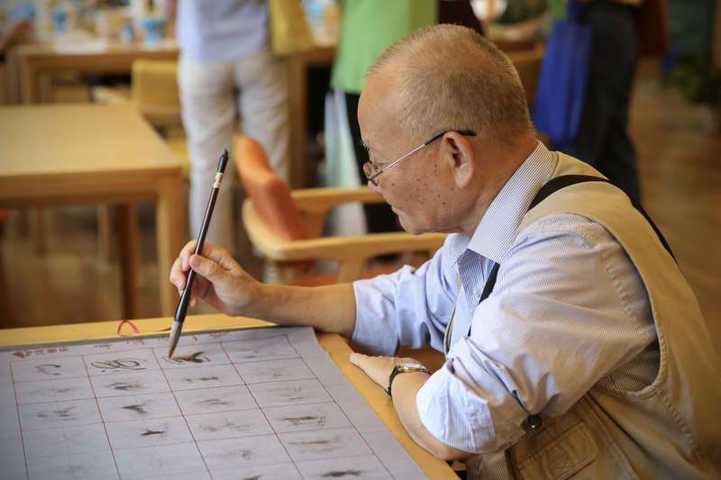 7月16日,上海市长宁区,虹桥街道社区综合为老服务中心,87岁的唐培鑫老人正在练习书法。“现在我几乎每天都来,写写毛笔字,和大家聊聊天,感觉特别好!”唐培鑫老人说。中青报·中青网见习记者 张玉佳/摄