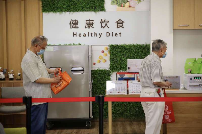 7月16日,上海市长宁区,虹桥街道社区综合为老服务中心,老人们正在排队取餐。中心内的餐饮服务由一家“互联网+餐饮+人工智能”的企业负责,开创性地将自动化烹饪与传统中式餐饮结合在了一起,并与虹桥街道社区助餐点合作,为社区老人提供荤素搭配、营养均衡、价格实惠的为老助餐便当。中青报·中青网见习记者 张玉佳/摄