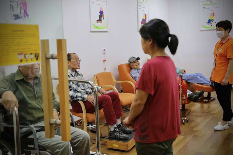 7月16日,上海市长宁区,虹桥街道社区综合为老服务中心,老人们正在器械室内进行康复训练。中青报·中青网见习记者 张玉佳/摄