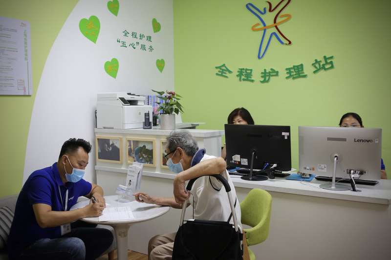 7月16日,上海市长宁区,虹桥街道社区综合为老服务中心,一位老人正在全程护理站咨询护理服务。这里主要是为老人提供基础生活护理、康复训练、医疗照护、远程监护等多样化的居家养老服务。中青报·中青网见习记者 张玉佳/摄