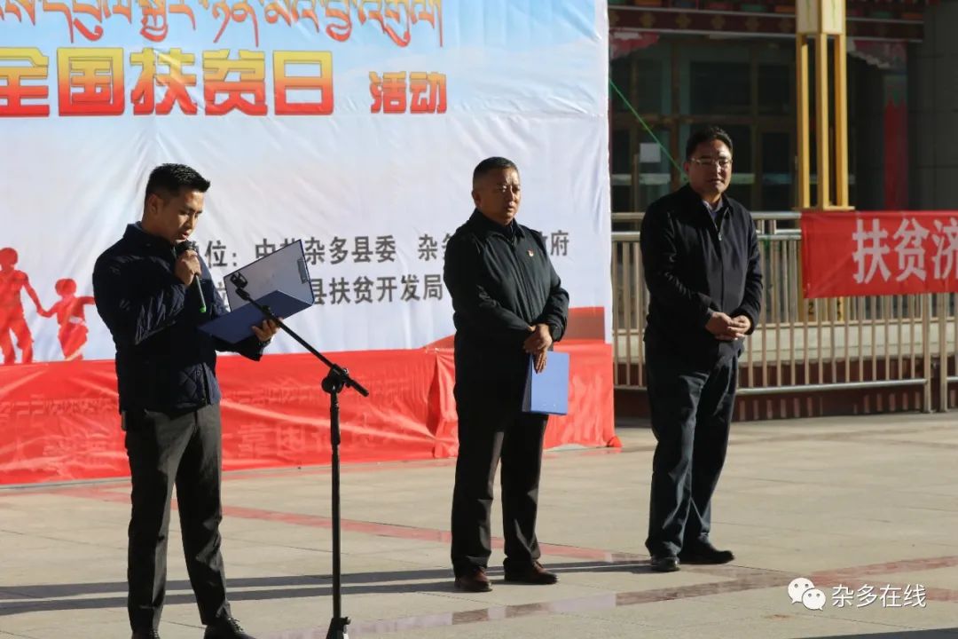 扎西东周部长指出,今天是全国第七个扶贫日,也是第28个国际消除贫困日,通过几年的努力杂多县全面落实了各项脱贫政策, 全力解决了突出短板问题。推动交通 、住房 、饮水 、教育、 健康、产业 、就业等进一步提高质量上台阶 ,党的建设全面加强 ,基层政权更加稳固, 城乡面貌焕然一新, 特色产业发展壮大, 基层治理大幅改善 ,生态环境持续向好, 群众获得感和幸福感明显提升;下一步将全面贯彻落实好中央 、省 、州各项决策部署,围绕乡村振兴战略和十四五规划,让“五个杂多”的建设再创新成绩。