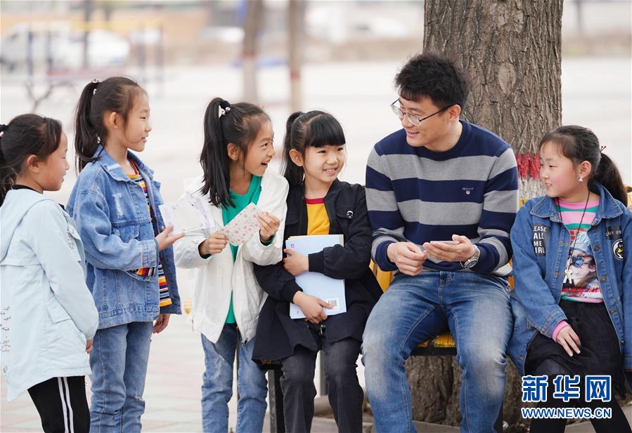 北京市海淀区中关村第三小学雄安校区派驻教师冯小宇同孩子们交流(2019年3月20日摄)。新华社发