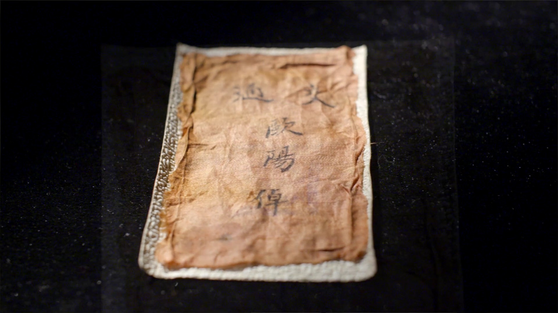 1978年,欧阳倬一个人孤苦地离开了人世。后来,生产大队把他的房子交给他的亲戚。在打扫房子时,他们在楼上的一个墙洞里发现了一个油布包,左一层右一层打开一看,是两份交通证。一份是白色棉布做的,是通往白区的交通证,但因为时间久远,一扯就破了,非常可惜;另一份就是我们看的这件交通证,它是绸布制作的,得以保存下来。这份交通证现在是国家一级文物,非常珍贵。
