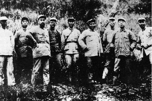 1933年红一方面军部分领导同志在建宁合影。左起:叶剑英、杨尚昆、彭德怀、刘伯坚、张纯清、李克农、周恩来、滕代远、袁国平