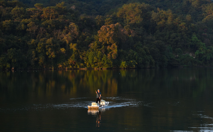 11月20日,常口村村民在村旁的金溪上划船。 新华社记者 宋为伟 摄