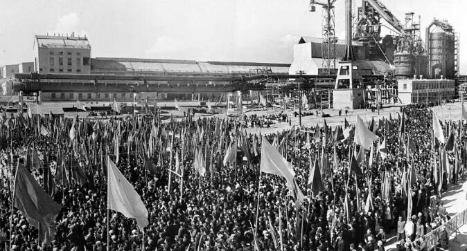 1959年10月15日,在包钢一号高炉前面广场上,举行了出铁剪彩典礼大会。新华社记者李基禄、陆轲摄