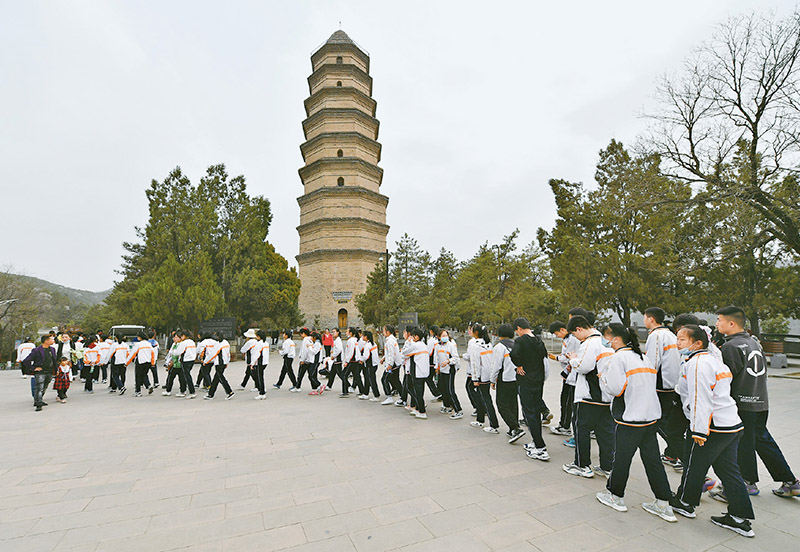 2022年10月,习近平总书记在瞻仰延安革命纪念地时指出,延安革命旧址见证了我们党在延安时期领导中国革命、探索马克思主义中国化时代化的光辉历程,是一本永远读不完的书。图为参观者在陕西延安宝塔山参观。 新华社记者 张博文/摄
