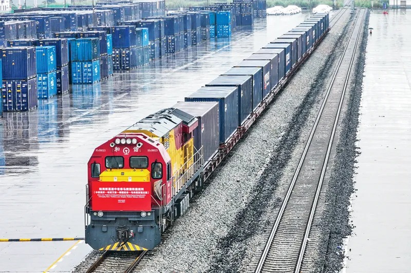 今年以来,我国积极维护国际产业链供应链稳定畅通,有效满足世界市场多样化需求,巩固拓展经贸合作“朋友圈”,国际循环的质量进一步提升。图为2024年6月27日,西部陆海新通道中老泰马跨境铁路班列在重庆江津小南垭站等待发车。新华社记者 唐奕/摄