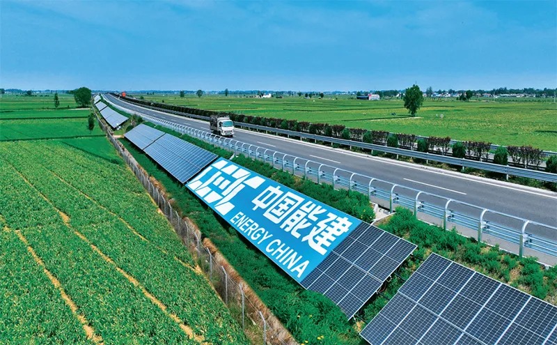 图为2024年5月10日拍摄的中国能建投资建设的全国首个全路域交能融合示范项目——山东枣菏高速公路交能融合(源网荷储一体化)示范工程。该工程利用路侧边坡、服务区、收费站等建设光伏发电设施,实现电力“自发自用、余电上网”。中国能建供图
