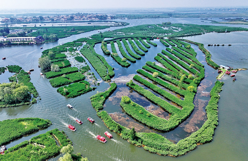 通水10年来,南水北调东、中线一期工程已累计向北方地区50多条河流生态补水110多亿立方米,助力华北地区地下水超采综合治理,推动滹沱河、白洋淀等一大批河湖重现生机。图为2024年5月8日,游船在河北雄安新区白洋淀内游览。 新华社记者 牟宇/摄