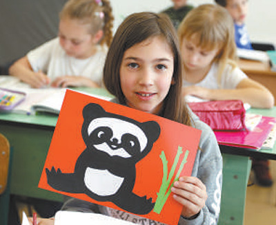 5月3日,匈牙利布达佩斯匈中双语学校的学生展示自己的美术作品。 新华社记者 赵丁喆摄