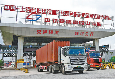 7月26日,运送集装箱的货车从中国—上海合作组织地方经贸合作示范区多式联运中心中铁联集青岛中心站驶出。 新华社记者 李紫恒摄