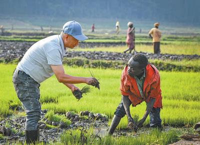 8月14日,在卢旺达南方省胡耶区的中国援卢旺达农业技术示范中心,中国水稻专家指导当地稻农进行秧苗移栽。 新华社记者 韩 旭摄