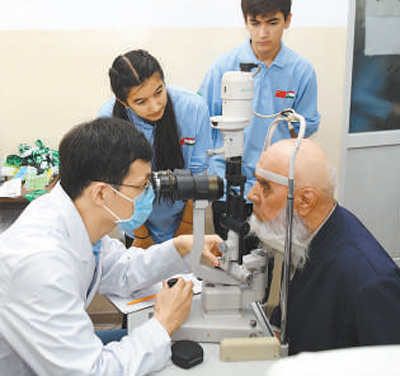 6月14日,“健康快车塔吉克斯坦光明行”活动现场,中方医生正在为塔吉克斯坦患者进行检查。 托西尔江·萨伊多夫摄