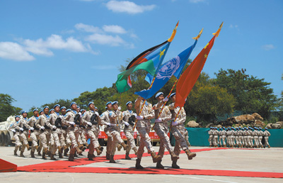 10月3日,在联合国驻南苏丹特派团中国营区内举行的授勋仪式上,中国第十批赴南苏丹(朱巴)维和步兵营官兵走过检阅区。 贾方文摄(影像中国)