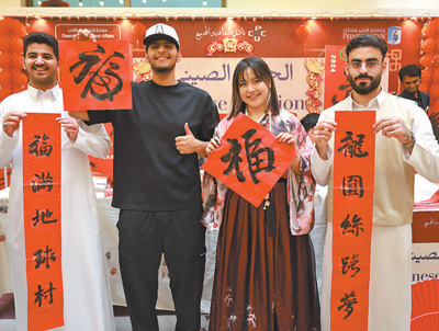 1月29日,沙特阿拉伯利雅得苏尔坦亲王大学孔子学院龙年春节活动上,该校学生展示中国书法作品。 新华社记者 王海洲摄