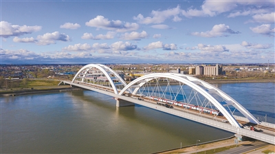 3月12日,一列火车行驶在匈塞铁路塞尔维亚境内贝诺段诺维萨德多瑙河大桥上。 任卫云摄(新华社发)