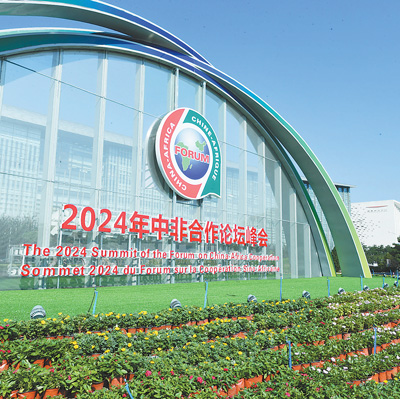 8月29日,在北京国家会议中心附近拍摄的2024年中非合作论坛北京峰会标识。 新华社记者 任 超摄