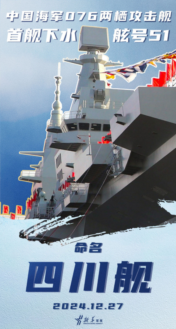 经中央军委批准,076两栖攻击舰首舰命名为“中国人民解放军海军四川舰”,舷号为“51”。四川舰满载排水量4万余吨,设置双舰岛式上层建筑和全纵通飞行甲板,创新应用了电磁弹射和阻拦技术,可搭载固定翼飞机、直升机、两栖装备等,是海军新一代两栖攻击舰,是推进海军转型建设发展、提升远海作战能力的关键装备。该舰下水后,将按计划开展设备调试、系泊试验、航行试验等工作。
