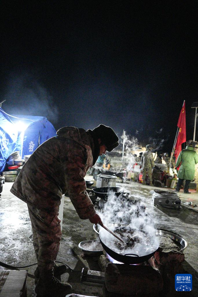 1月7日,在定日县古荣村集中安置点,解放军为受灾群众做饭。新华社记者 晋美多吉 摄